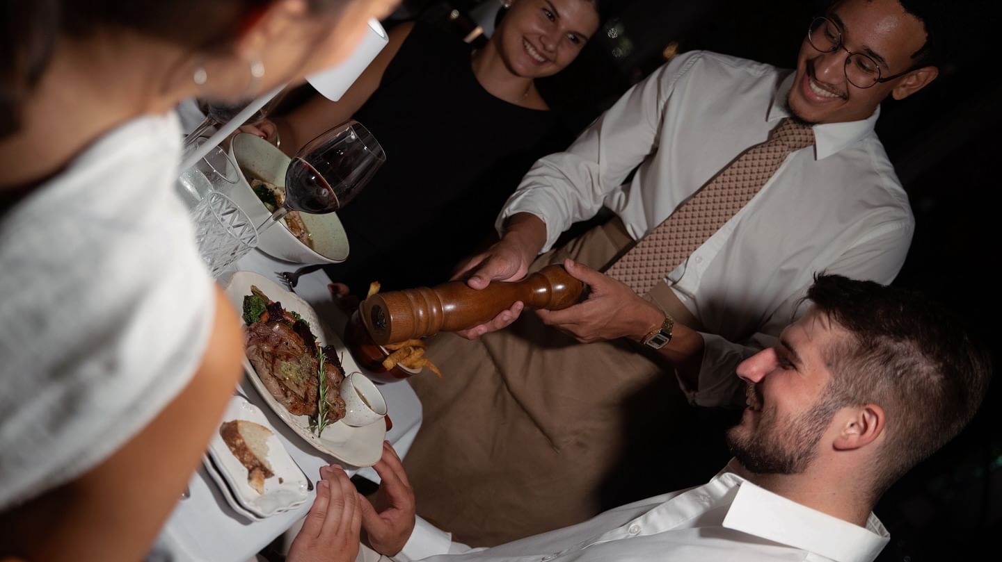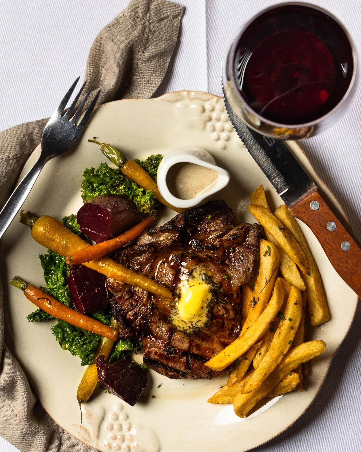 - Steak Frites – A-grade sirloin (250g), served with café de Paris butter, roasted carrots, beets, kale, and hand-cut herbed fries, complemented by your choice of béarnaise or mushroom parmesan sauce.