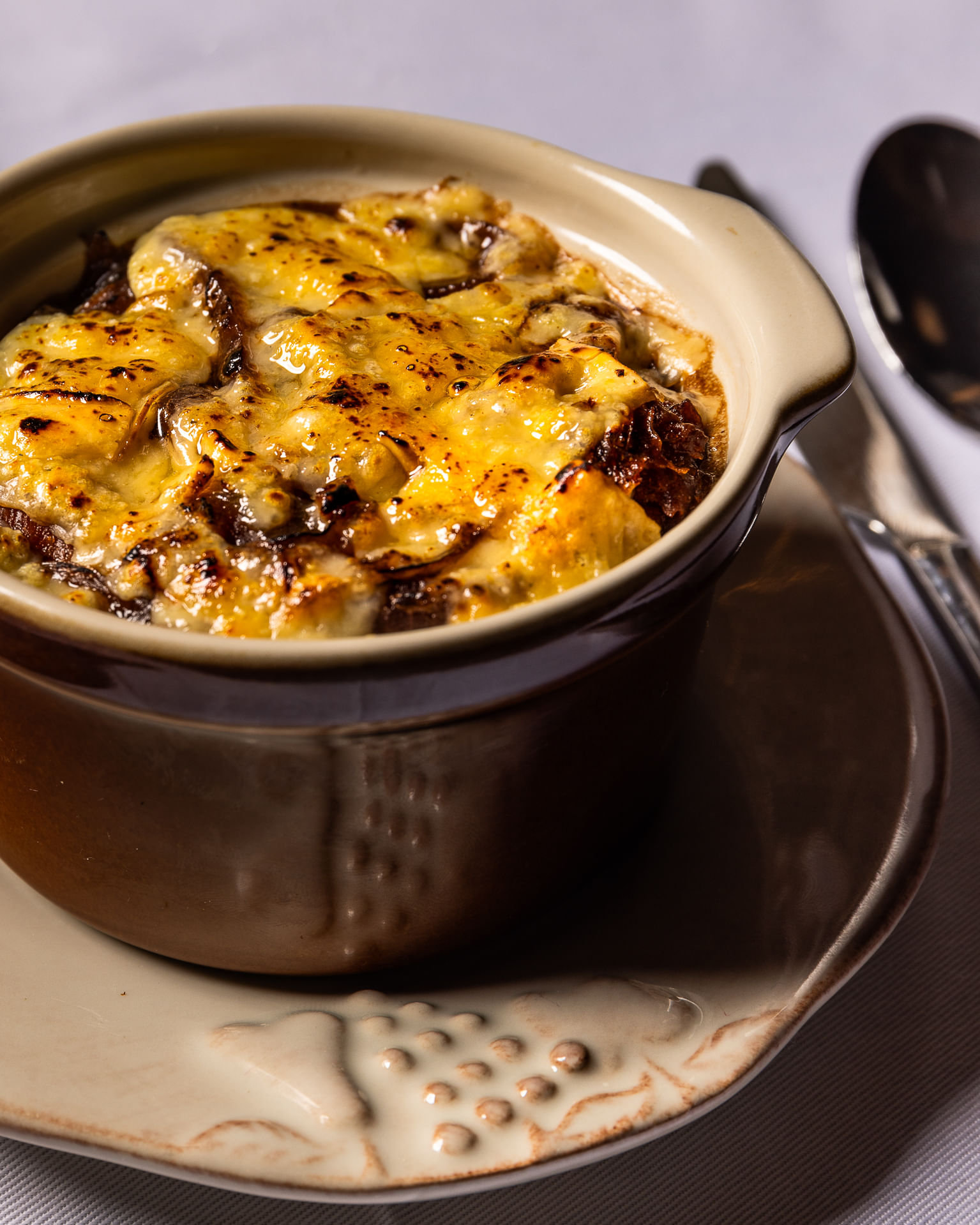 - Petite Soupe à l’Oignon – A rich and aromatic onion broth, topped with a gratinéed croissant toast and local Gruyère.